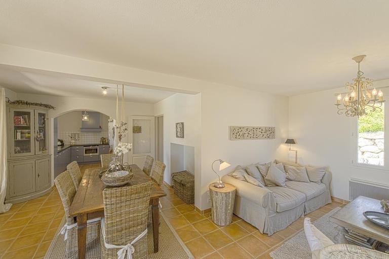De villa heeft een gezellige woonkamer met een aparte eethoek die aansluit op de open keuken.