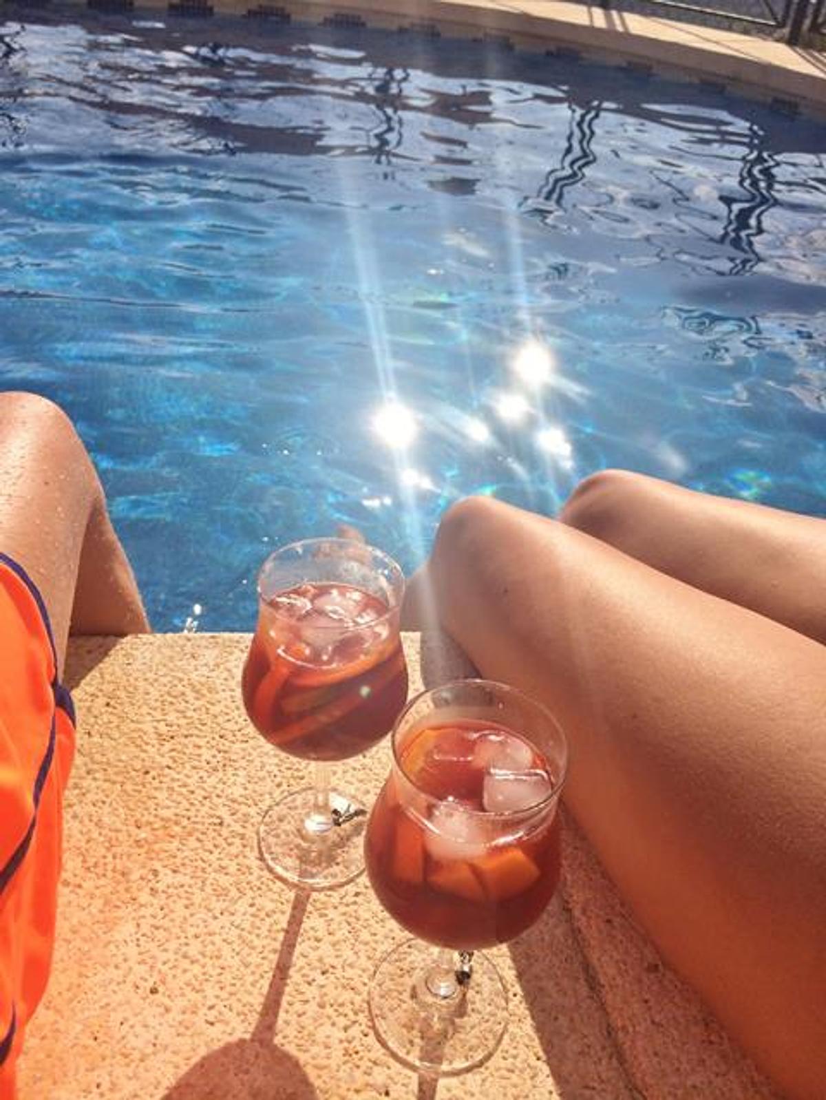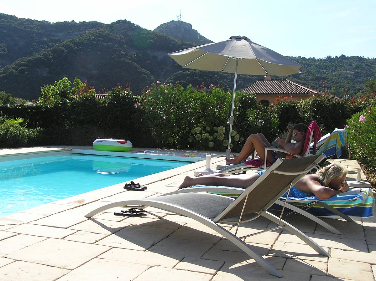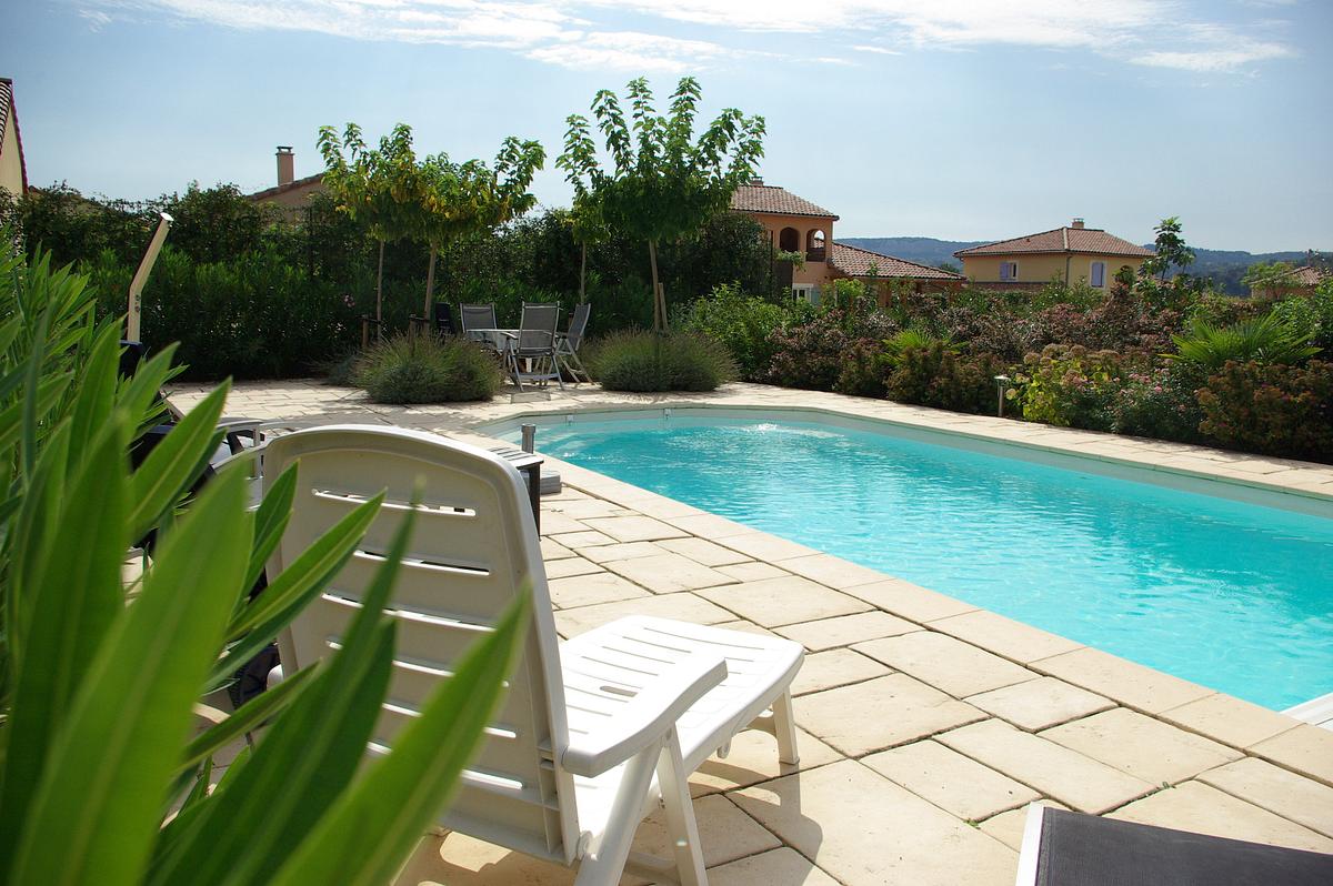 De grote en brede achtertuin ligt op het Zuid-Westen met daarin een verwarmd privé zwembad van 9.40 x 4.20 meter met gemakkelijk in te lopen zgn. Romaanse trap. Deze is voorzien van een leuning, er is verlichting en het heeft een elektrisch bedienbaar rolluik. Ook is er een Solar buitendouche. Voor het zwemplezier voor ouders met kleine kinderen tot 11 kg. hebben we een geweldig leuke zwembadring of zgn. babydobber aangeschaft: zie het Youtube filmpje onder het tabblad "bijzonderheden". Rondom het zwembad is een terras aangelegd waar de ligstoelen en de 4 parasols hun plek hebben plus een zitje onder de 4 schaduw gevende moerbeibomen. De tuin is onder architectuur aangelegd en heeft een aantal palmbomen, diverse vlinderstruiken, hortensia's, rozen, oleanders, lavendel, een vijgen- en een olijfboom, er is een cipressenhoek waarin opgenomen een mooi marmeren kunstwerk. De tuin is verder voorzien van tuinverlichting en een automatisch besproeiingssysteem.