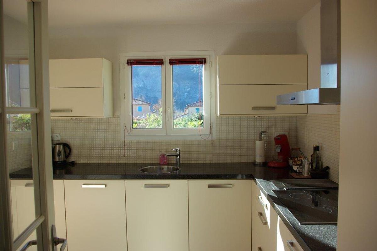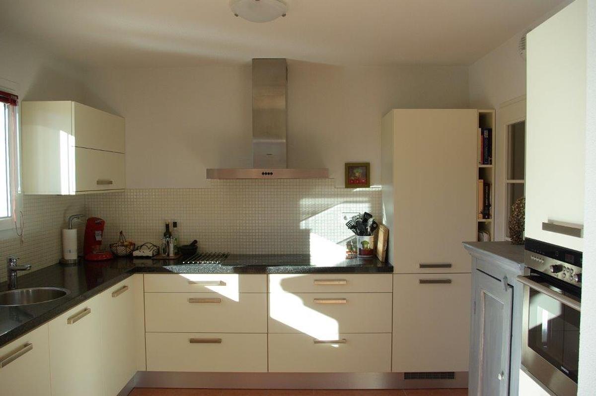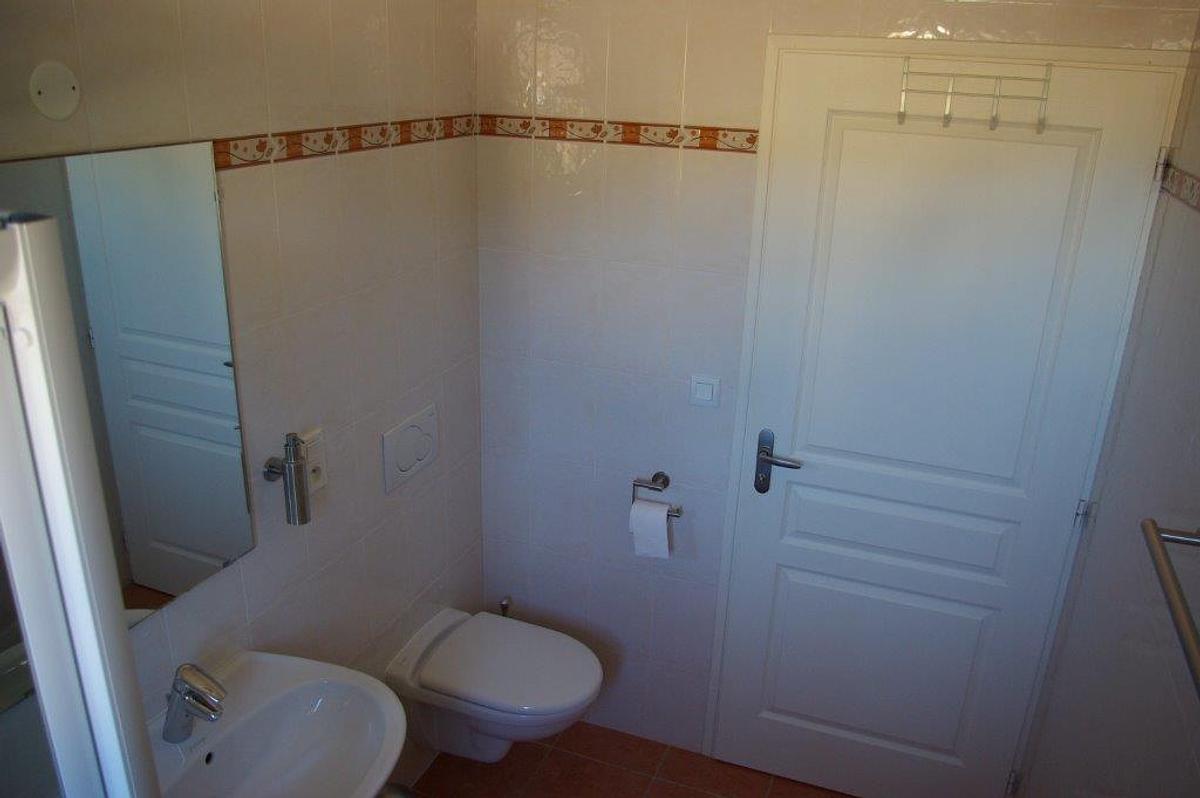 Grote eettafel met 6 leren stoelen. Voor de schuifpuien zijn elektrisch bedienbare rolluiken en voor alle andere ramen zijn Provençaalse houten luiken. Gemiddelde zomertemperatuur in deze omgeving is 32-36 graden, met al vanaf april tot oktober vele warme dagen met strakblauwe luchten.